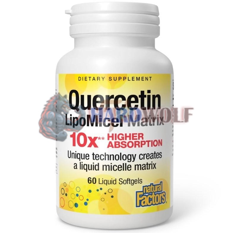 Пищевая добавка от канадского бренда Натурал Факторс содержит кверцетин в мицелярной форме, изготовленный с использованием уникальной технологии "LipoMicel Matrix", десятикратно увеличивающей абсорбцию и биологическую активность вещества. Добавка представлена в форме мягких софтгель капсул с жидким содержимым.