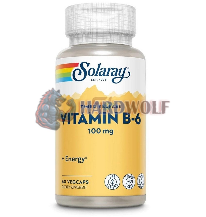 Пищевая добавка от американского бренда Соларей содержит витамин B6 (пиридоксин гидрохлорид) с функцией постепенного высвобождения, в веганских капсулах в дозировке 100 мг, что составляет 5882% суточной нормы потребления. Количество порций в упаковке: 60